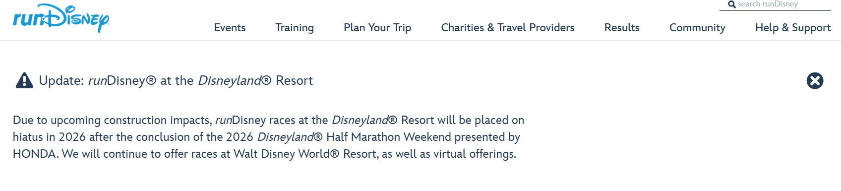 RunDisney announced today via a banner on their website that Disneyland races will be "on hiatus" following the 2026 Disneyland Half Marathon Weekend from January 29, 2026 through February 1, 2026. The banner (pictured above) cites "upcoming construction impacts" as the primary reason for the hiatus, although a detailed post by Disney Tourist Blog implies more going on.