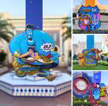 I won't go over each medal in too much detail - they're all pretty cartoonish (in a good way!) as most of the SS medals have been in recent years. They don't seem to have the same mystique as the WDW Marathon Weekend medals, nor are they as regal and polished as the Princess Half Marathon medals. However, runDisney did manage to capture each partnership with a crucial element of each duo's movie. You've got the badge shape and magnifying glass for the Zootopia-themed 5k, Pooh's honey pot for the 10k, the different memories for the Inside Out 10-miler, and of course the lamp and flying carpet for the Challenge medal.