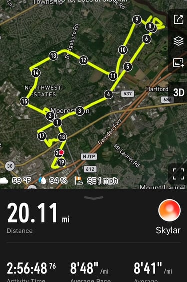 As of this writing I just wrapped up my eighth week of training where I closed out a 54-mile week with my first 20-miler (above). I can confirm: the Pfitz plan is definitely more intense than the Hal Higdon marathon plans. Unlike previous training programs, I'm finding the Pfitz 18/55 ramps up much more quickly in mileage. After a couple "easy" weeks in the 30-something mile range, the weeks jumped into the 40s and then 50+ in Weeks 7 and 8. The Pfitz 18/55 (which is a "beginner" level amongst the higher-mileage Pfitz plans) counts on turning fatigue into acclimation before tapering into the marathon.